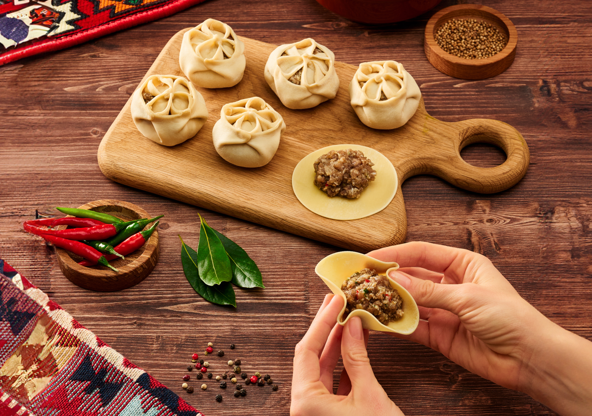 И множество других оригинальных начинок: с бараниной, мраморной говядиной, цыплёнком и сыром, крабом или нежной сёмгой — для тех, кто предпочитает морепродукты. А также мини-хинкали, манты и многое другое для ваших быстрых, вкусных и разнообразных ужинов.